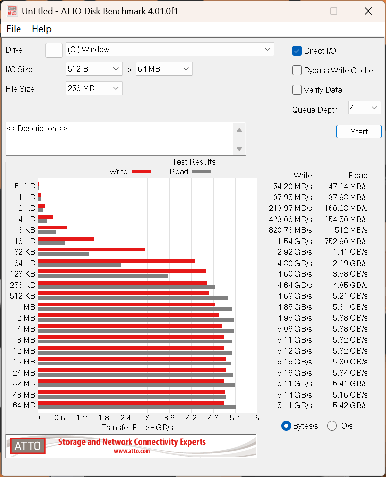 在ATTO Disk Benchmark测试中,长江存储PC41Q 1TB SSD的0.5K小文件读写速度达到了47MB/s和54MB/s,从512K开始速度基本达到最大,最终读写速度可以超过5GB/s。