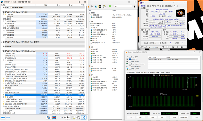 MEOW R16 Pro笔记本单烤CPU时,AMD锐龙7 8745HX处理器可以稳定释放超过90W的功率,温度控制在96度左右。