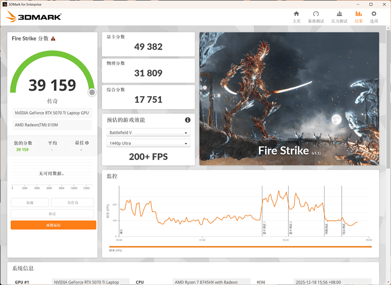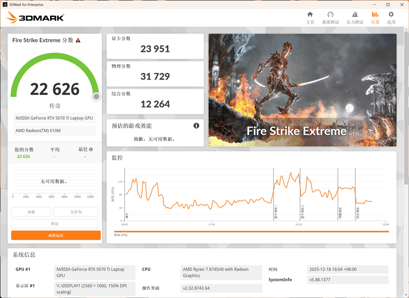 MEOW R16 Pro笔记本搭载的NVIDIA GeForce RTX 5070Ti Laptop显卡,在3Dmark的Time Spy测试中,显卡分数分别为17499和8218。