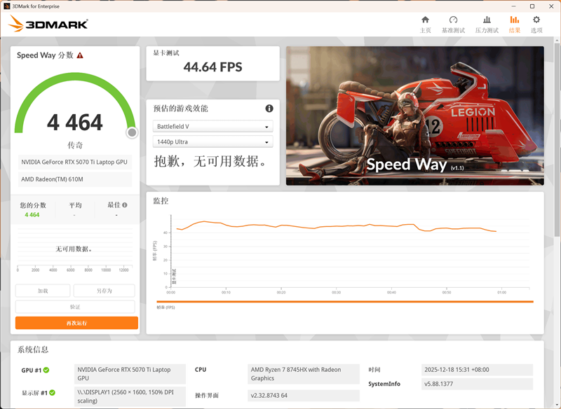 MEOW R16 Pro笔记本在3Dmark中Speed Way测试中,总成绩为4464,显卡测试成绩为44.64fps。