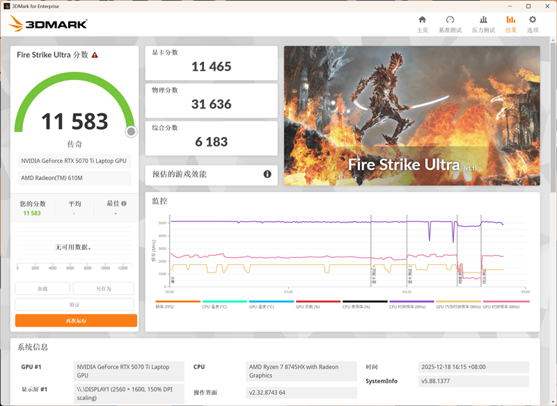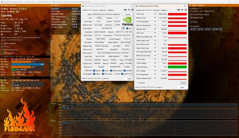 之后我们对NVIDIA RTX 5070 Ti Laptop GPU进行十分钟的烤机测试, NVIDIA RTX 5070 Ti Laptop GPU可以稳定释放140W的功率,核心频率1995MHz,温度72.5度。