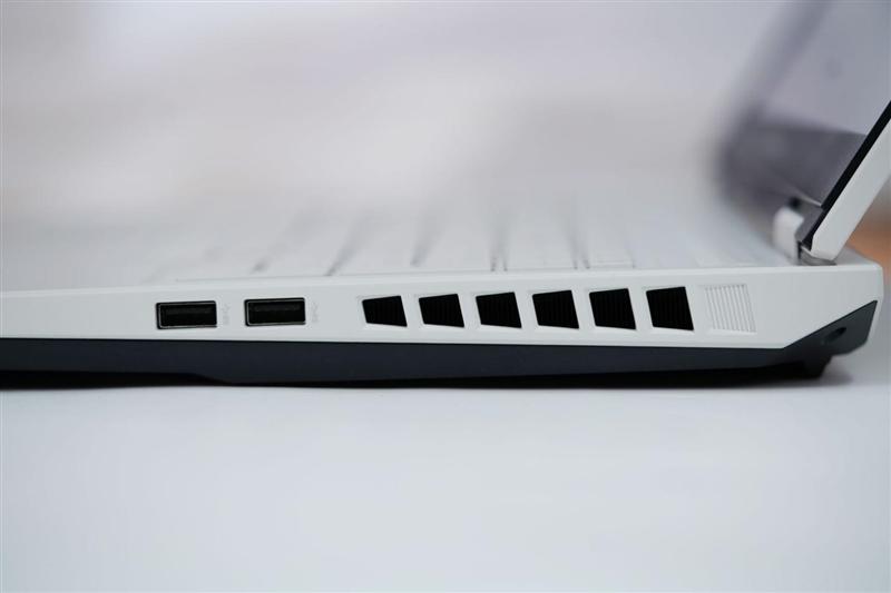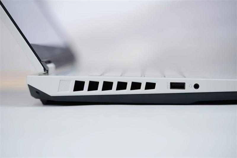 MEOW R16 Pro笔记本在机身两侧都设计了巨大的散热风扇出风口,接口方面右侧提供了两个USB-A接口,左侧提供了一个USB-A接口和一个3.5mm复合音频接口。