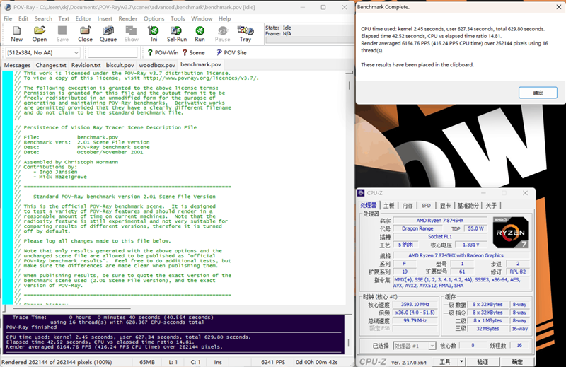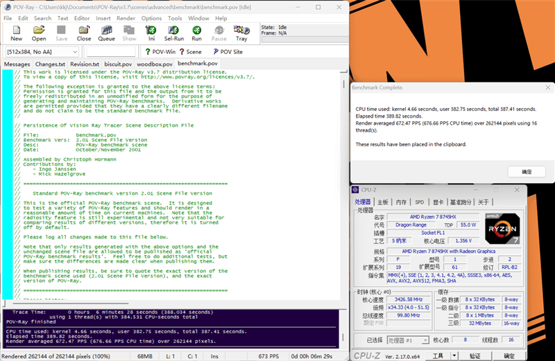 POV-Ray测试中,单核成绩为672.47pps,多核成绩为6164.76pps。