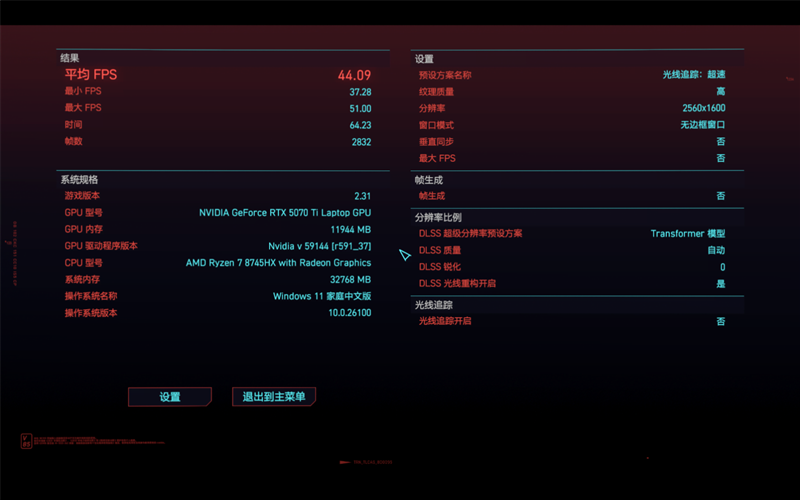 在《赛博朋克:2077》中,使用光线追踪:超速画质预设和DLSS帧生成,记录4K分辨率时的游戏帧数。