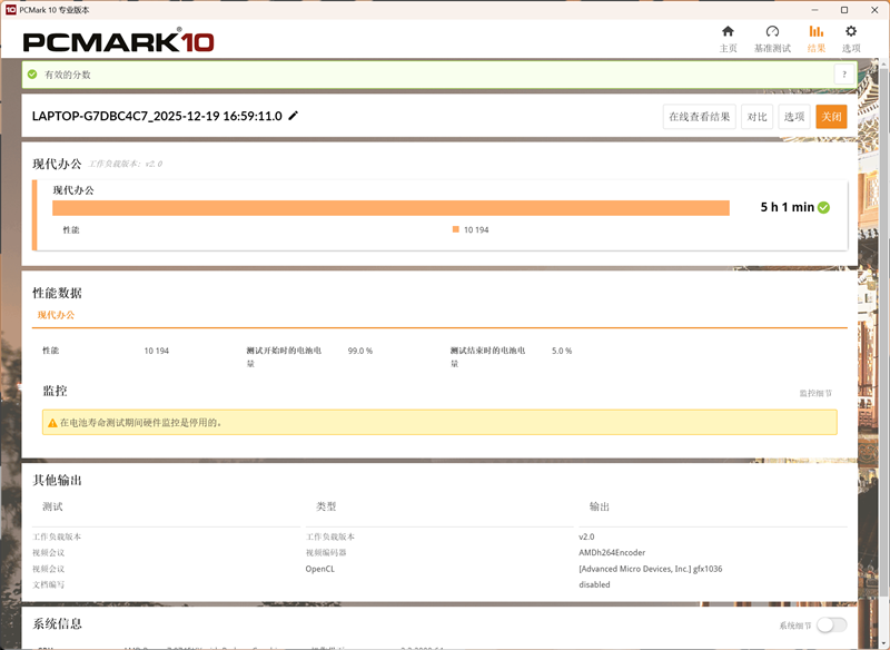 MEOW R16 Pro笔记本由于机身前缘斜切的楔形设计,内部电池空间受到限制,所以电池体积也受到限制,仅有63.05Wh容量,在PCMark10现代办公续航测试中,从99%电量到5%,续航时间为5小时1分钟。