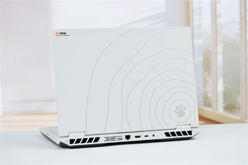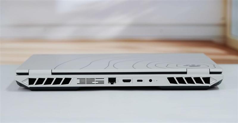 MEOW R16 Pro笔记本尾部两侧还有巨大的散热风扇出风口,中间提供了一个有线网口,一个HDMI接口,一个同时支持视频输出和PD充电的USB 3.2 Gen2 Type-C接口和一个圆形电源接口。