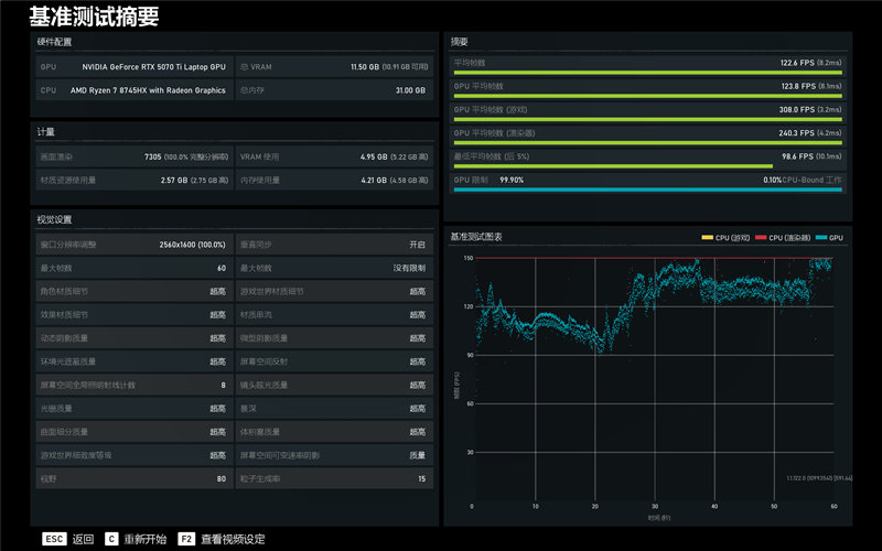 在《战争机器5》中,使用2K分辨率超高画质测试,最终测试成绩为122.6FPS。