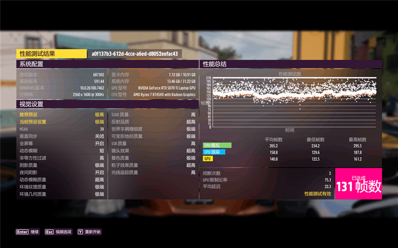 在《极限竞速:地平线5》中,使用2K分辨率极端画质测试,最终测试成绩为131fps。