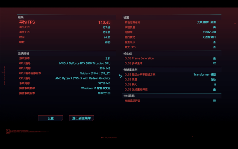 《赛博朋克:2077》在开启DLSS 4最高的4X级别多帧生成时,在4K分辨率下的测试帧率从44.09提高到140.45。