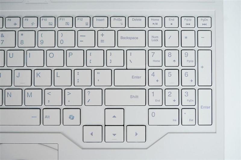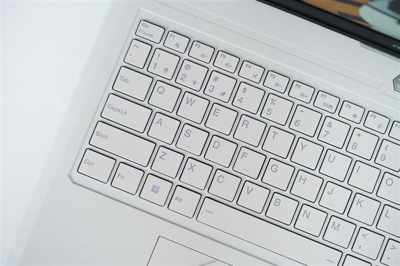 MEOW R16 Pro笔记本C面采用了和顶盖相同的金属银白色,得益于16寸的尺寸,键盘区域十分宽大,右侧放置了完整的数字键区,主键区的键帽也更宽大敲击时更加舒适,数字键采用了全高键帽,并使用了下沉设计,支持单键RGB背光,电源键独立于键盘之外,六边形的金属质感按键中间带有镂空的电源指示灯。