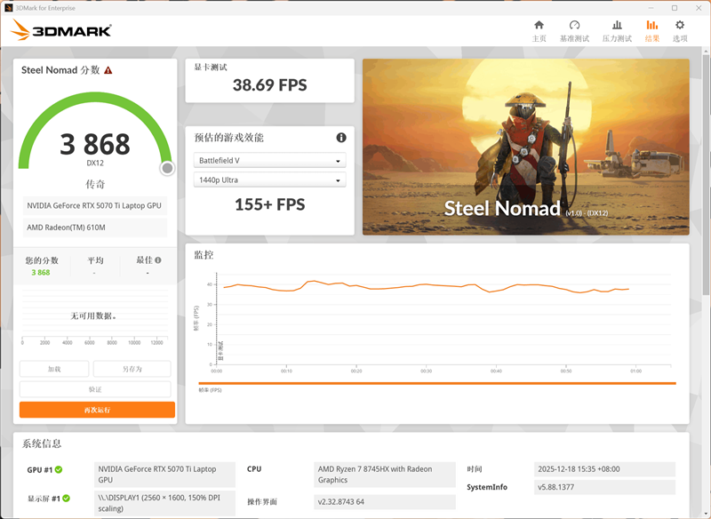 在3Dmark的Steel Nomad测试中,总成绩为3868,显卡测试成绩为38.69fps。