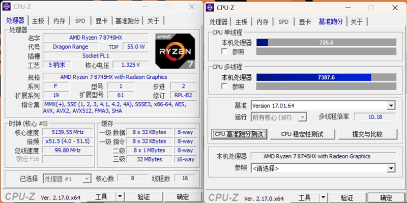 联MEOW R16 Pro笔记本搭载Intel酷睿Ultra 9 275HX处理器,在CPU-Z基准测试中,多线程成绩为7387.6,单线程成绩为725.5。