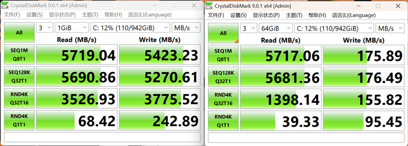 MEOW R16 Pro笔记本自带的长江存储PC41Q 1TB SSD,在CrystalDiskMark测试中,连续读写速度分别达到了5719MB/s和5423MB/s,4K读写速度也能达到68MB/s和242MB/s。