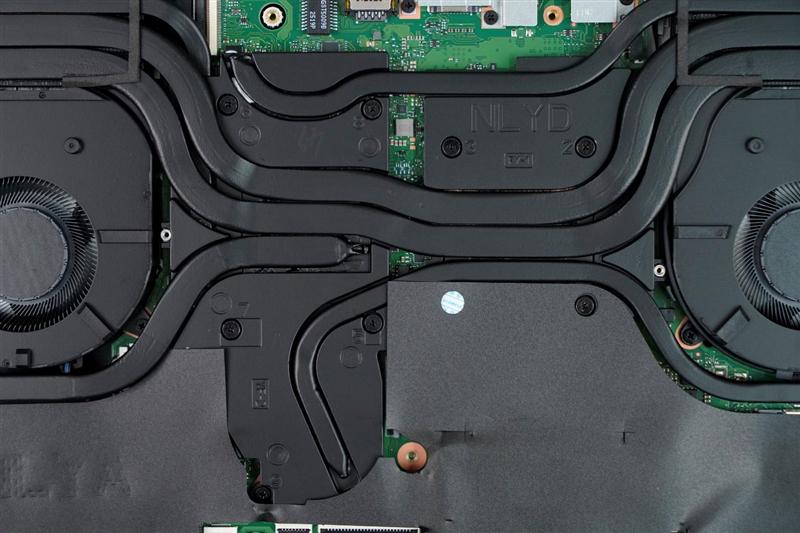MEOW R16 Pro笔记本搭载的酷冷Pro进阶优化散热系统,由两枚涡轮风扇和6根加粗复合热管组成,可以看到两枚风扇的风道设计都是同时向后方和侧方出风散热。
