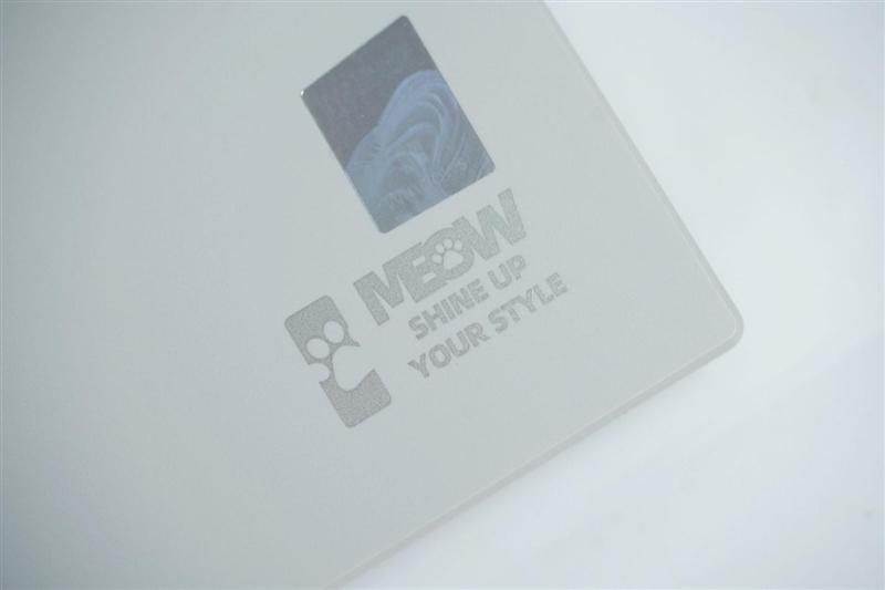 MEOW R16 Pro笔记本的顶盖采用了金属银白色设计,右下角印有一个猫爪,周围环绕这类似猫脚踩在水面泛起的涟漪的线条,左上角是橘色的猫爪Logo和七彩虹Colorfire MEOW标志。