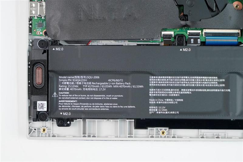 MEOW R16 Pro笔记本搭载了一块63.05Wh的电池,电池两侧布置有扬声器单元。