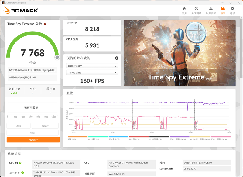 显卡方面则是NVIDIA最新的RTX 50系列,RTX 5070Ti Laptop显卡在所有的2K游戏测试中都表现的游刃有余,它支持的DLSS 4技术在最新的3A游戏中可以将帧率轻松提高超过200%,哪怕是外接显示器以4K分辨率运行也有一战之力。