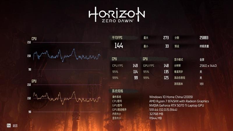 在《地平线:零之曙光》中,使用2K分辨率和终极质量画质测试,最终测试成绩为144fps。