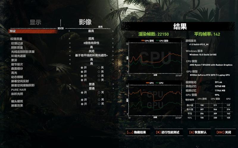 在《古墓丽影:暗影》中,使用2K分辨率和最高画质,测试平均帧率为142。
