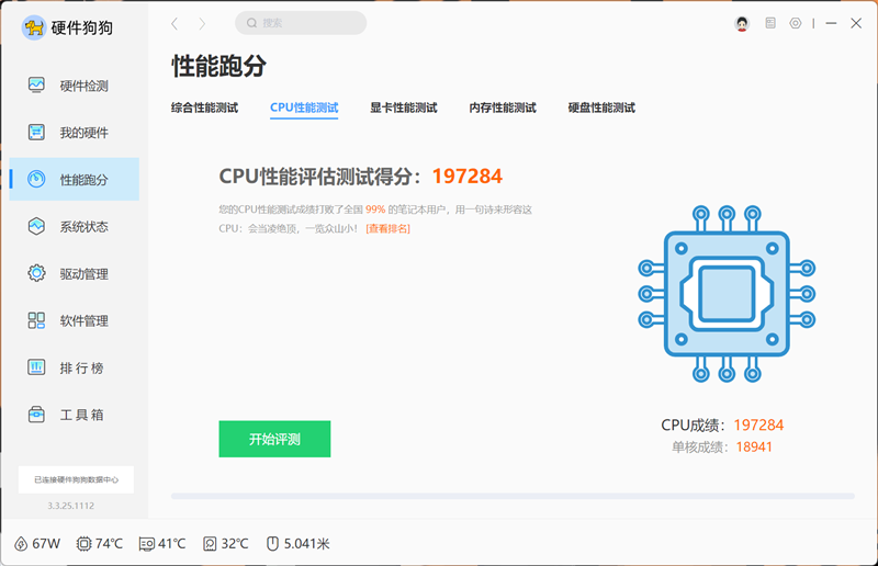 MEOW R16 Pro笔记本在硬件狗狗中,核心硬件性能总分为760015,超过全国99%的用户,其中CPU评分为197284。