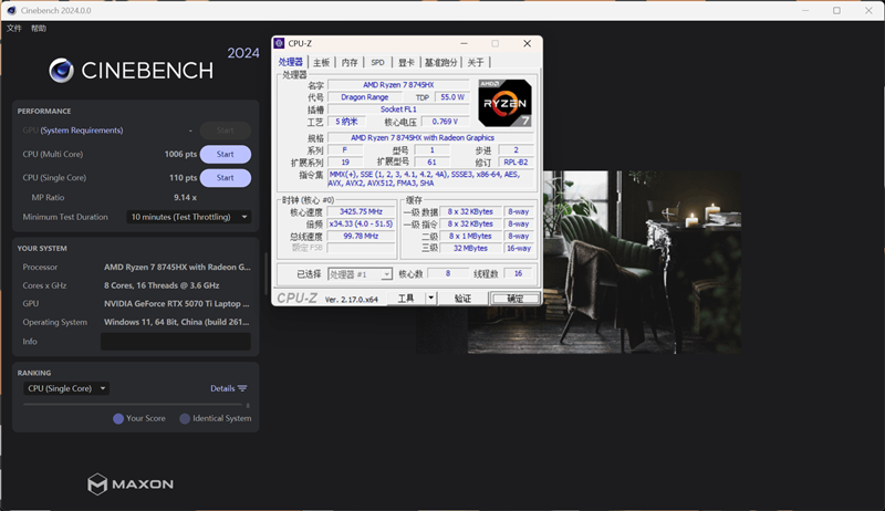 CINEBENCH 2024测试,CPU单核成绩110pts,多核成绩1006pts。