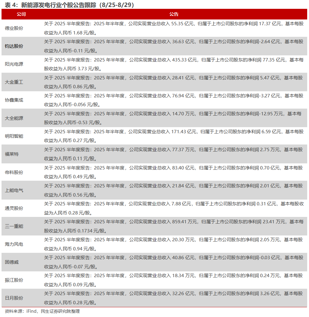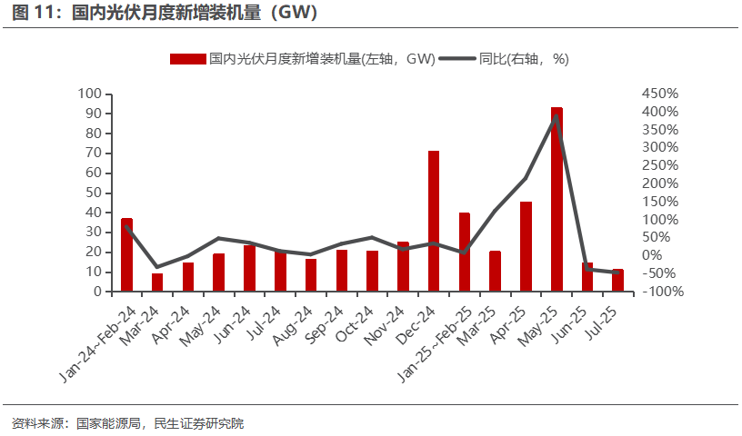 2)8月23日,国家能源局发布1-7月份全国电力工业统计数据。截至7月底,2025年1-7月太阳能发电装机容量新增223.25GW,同比增长80.73%。7月单月太阳能发电装机新增11.04GW,同比下降47.55%,环比下降23.12%。