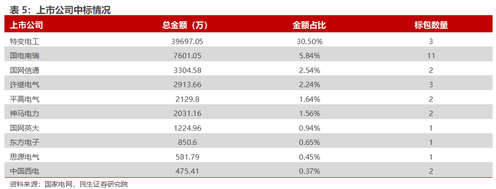 分中标公司来看,公示中标企业54家,人均中标2410万元,从上市公司的中标情况来看,特变电工中标3.97亿元,总中标金额占比30.5%,排名第一;国电南瑞中标7601万元,总中标金额占比5.84%,排名第二;国网信通中标3305万元,许继电气中标2914万元,平高电气中标2130万元,神马电力中标2031万元,国网英大(维权)中标1225万元,东方电子中标851万元,思源电气中标582万元,中国西电中标476万元。
