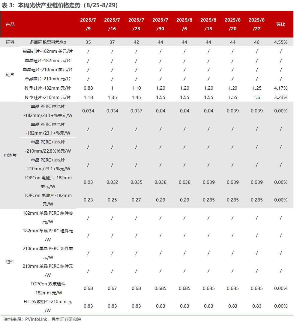 硅片:根据infolink统计,本周硅片市场价格相较上周出现小幅上涨,主要受到上游硅料价格抬升及”反内卷”会议持续发酵的影响,厂家顺势推动报价走高。观察各尺寸硅片,主流成交价格普遍上调约每片 0.05 元:183N 涨至每片 1.25 元人民币;210RN 上涨至每片 1.40 元人民币;210N 则上行至每片 1.60 元人民币。细部来看,183N 因产出占比萎缩,供需关系相对紧俏,本周涨价因而成功落地;210RN 则在供应量增加的背景下,部分厂家对新价格仍处于观望,短期内接单节奏偏慢,但随着本周内多数厂家陆续跟进,成交逐步回暖;至于 210N,则在需求支撑下维持稳定上涨。