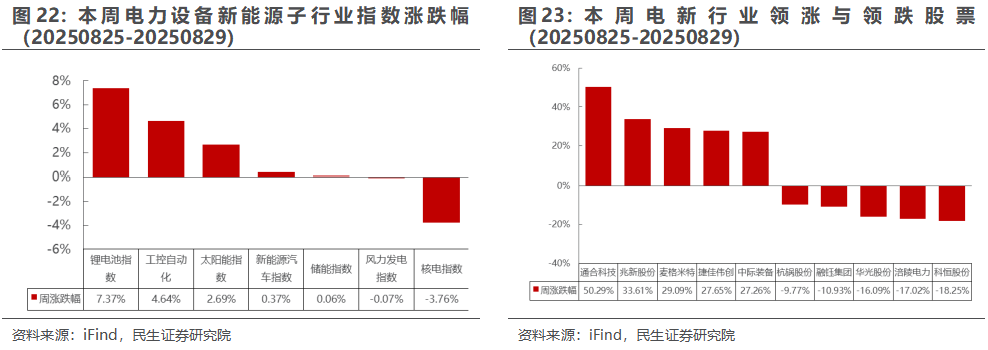 板块子行业:本周锂电池指数涨幅最大,核电指数跌幅最大。新能源汽车指数上涨0.37%,储能指数上涨0.06%,工控自动化上涨4.64%,太阳能指数上涨2.69%,风力发电指数下跌0.07%,核电指数下跌3.76%,锂电池指数上涨7.37%。