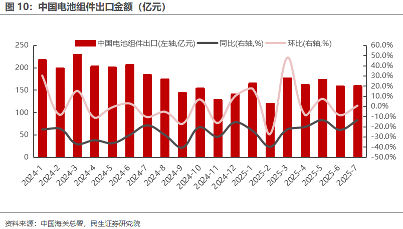 2025年1-7月国内组件出口金额为1112.51亿元,同比-22.63%,7月单月出口158.86亿元,同比+0.50%,环比-13.69%。