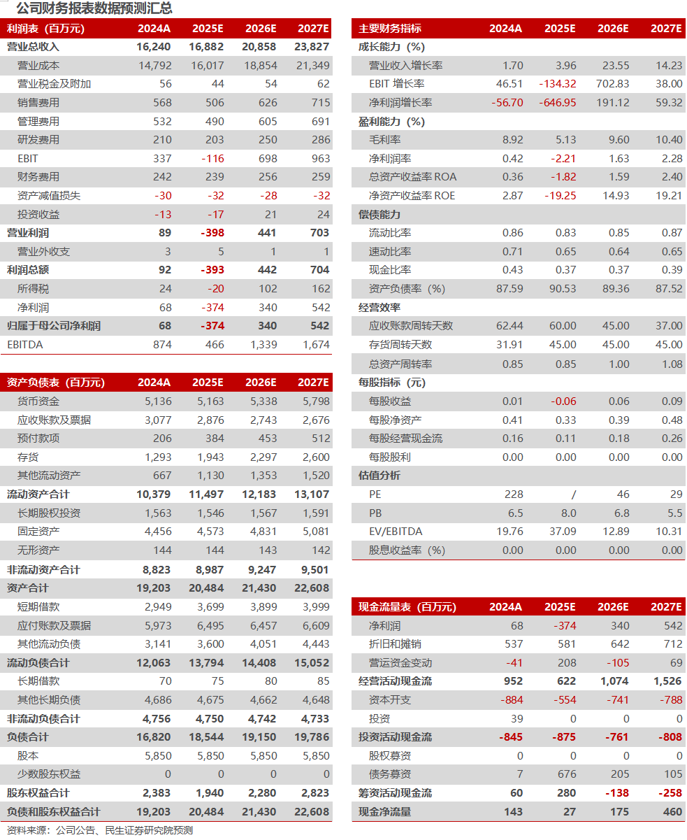 我们预计公司2025-2027年营收分别为168.82、208.58、238.27亿元;归母净利润分别为-3.74、3.40、5.42亿元,以8月29日收盘价为基准,对应2026-2027年PE为46X、29X,公司组件业务稳步发展,海外销售有望继续增长,维持“谨慎推荐”评级。